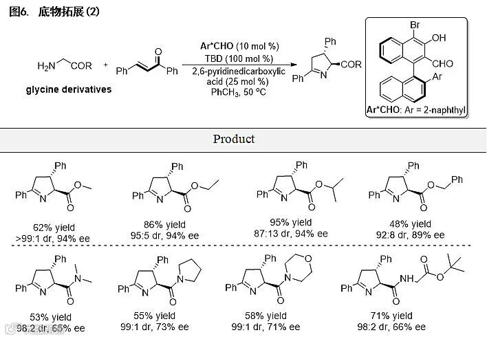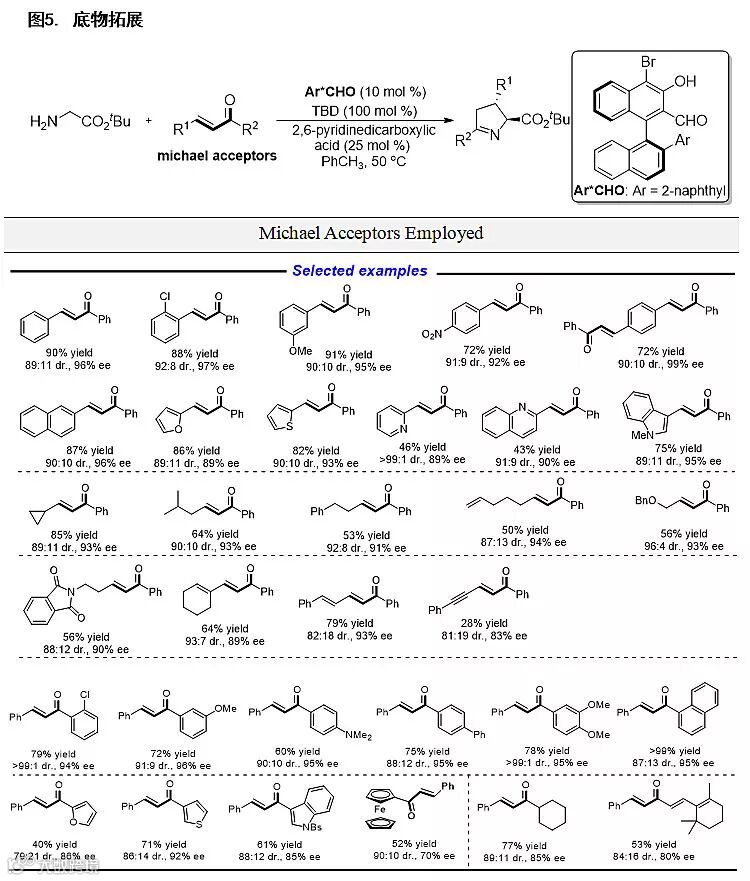 经过进一步的条件筛选和优化,他们得到最优的反应条件,并在该条件下对底物的适用范围进行考察。该催化体系具有非常广泛的底物适用性(>70 examples),对于各种取代基修饰的苯基、杂芳香基、烷基、烯基以及炔基取代的α,β-不饱和酮均具有很好的反应活性和立体选择性,对于醚键和酰胺键也具有一定的官能团兼容性(图5)。值得一提的是,作者还首次实现了醛催化甘氨酸衍生的酰胺和二肽的不对称活化,以中等的收率和对映选择性获得相应的目标产物,展现了醛催化在实现甘氨酸衍生的多肽结构修饰方面的潜力(图6)。