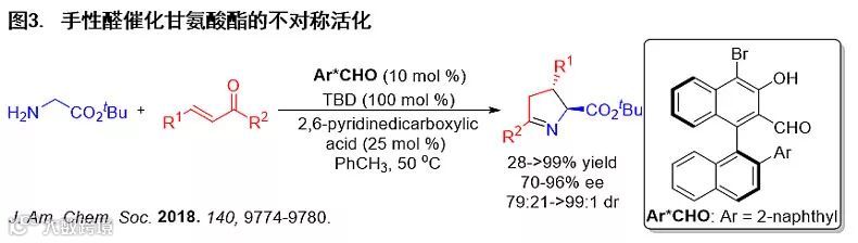 在这一启发性的工作之后,他们应用该策略实现了活性较低的伯胺类化合物的不对称活化,于最近取得了突破性进展。该课题组通过合理的设计,合成了一类更为高效的新型手性醛催化剂,将其用于甘氨酸酯的不对称活化,实现了手性醛催化甘氨酸酯对α,β-不饱和酮的不对称亲核加成/环化反应。相关工作在J. Am. Chem. Soc.上发表(图3)。