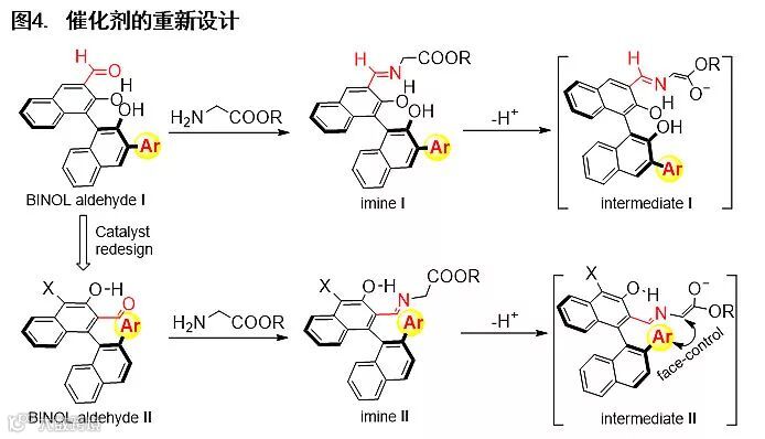 作者首先采用第一代手性醛催化剂BINOL aldehyde I对模板反应进行了尝试,但仅以中等的收率和对映选择性得到目标产物Δ(1)-吡咯啉。他们认为这可能是由于催化剂的催化位点(-CHO)和位阻基团(-Ar)均离手性中心较远,从而导致手性诱导效果较差。因此,作者对催化剂进行了重新设计:(1)将催化位点和位阻基团由3,3′位转移到离手性中心更近的2,2′位;(2)在催化剂的4位引入吸电子基团,以增加催化剂的活性。基于以上思考,作者合成了一系列新型的手性醛催化剂BINOL aldehyde II(图4),并将该类催化剂用于催化模板反应。结果表明,其催化活性和手性诱导能力均有了显著提高。