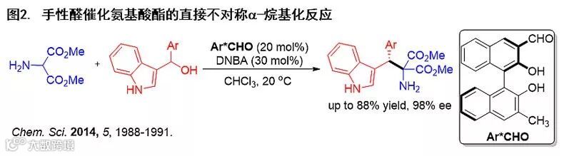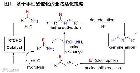 西南大学化学化工学院的郭其祥教授课题组一直致力于不对称合成方法学的开发及应用研究。2014年,郭其祥课题组首次提出了“基于亚胺活化机制的手性醛催化”策略:醛催化剂与伯胺类化合物形成亚胺中间体,通过亚胺活化机制形成活性α-亚胺碳负离子,继而进攻亲电试剂(E+),利用亚胺形成的可逆性原位解离生成含有游离氨基的手性胺,从而实现手性醛催化伯胺类化合物的不对称直接α-官能化反应(图1)。他们在该策略的指导下实现了氨基丙二酸酯与3-吲哚甲基醇的不对称烷基化反应(Chem. Sci., 2014, 5, 1988)(图2)。