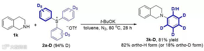 图4. 氘代三苯基鋶盐在t-BuOK作用下对胺类化合物的N-芳基化反应