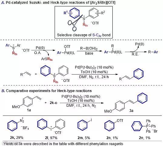 图1 钯催化的氟烷基芳基锍盐对硼酸的Suzuki偶联和对末端烯烃的Heck偶联