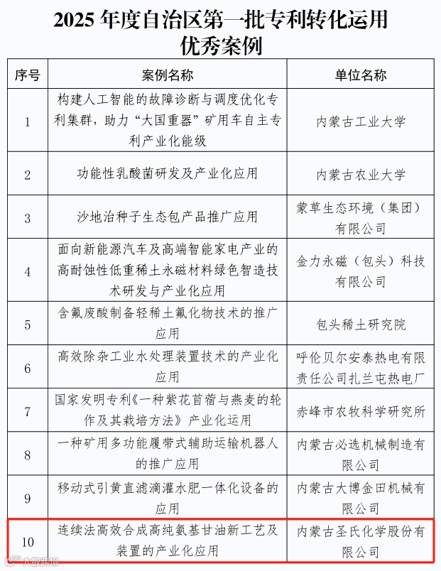 近日,内蒙古自治区市场监督管理局发布了《自治区市场监管局、知识产权局关于公布2025年度自治区第一批专利转化运用优秀案例的通知》,圣氏化学申报的“连续法高效合成高纯氨基甘油新工艺及装置的产业化应用”成功入选。