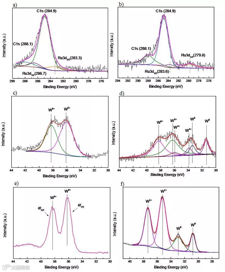 图4. a)新鲜Ru-W/SiO2催化剂的Ru 3d区域的非原位XPS光谱; b)还原后Ru-W/SiO2催化剂记录的Ru 3d核心能级的原位XPS谱;c, e)分别为新鲜(c)Ru-W/SiO2和(e)Ru/WO3催化剂的W 4f区域的非原位XPS光谱;d, f)分别为还原后(d)Ru-W/SiO2和(f)Ru/WO3催化剂的W 4f核心能级的原位XPS光谱。