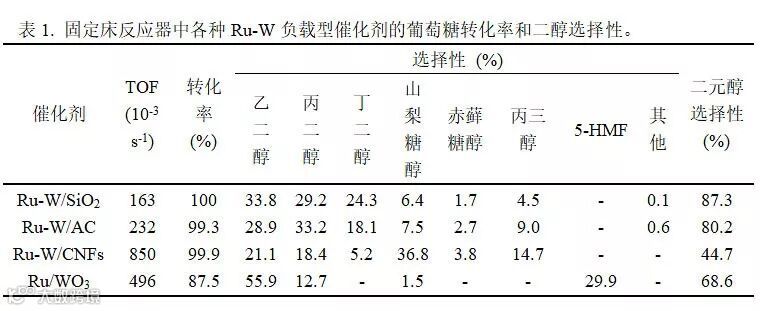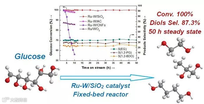 图1. 高效稳定的Ru-W双功能催化剂在连续固定床反应器中将葡萄糖催化氢解为低碳二元醇。