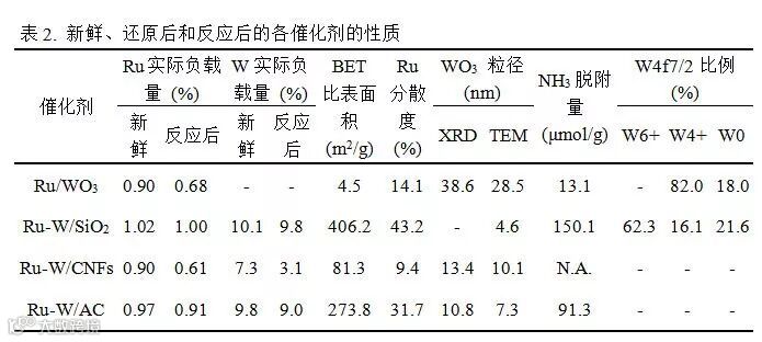 由氨脱附图可以看出,还原后Ru-W/SiO2催化剂在较低温度下的峰值可归入在弱酸性位上吸附的氨的解吸峰,而还原后的Ru-W/AC催化剂的高温解吸峰值为强酸位点。计算得到各催化剂的酸量顺序为:Ru-W/SiO2 > Ru-W/AC > Ru/WO3 > Ru-W/CNF。在葡萄糖氢解成二醇时,WOX微晶在产生固体酸位点以催化裂解糖分子中的C-C键中起关键作用。因此Ru-W/SiO2催化剂的丰富的酸位点和适度的酸强度将有助于提高二醇的选择性。