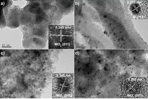图2. 在478K下反应10h后Ru-W负载型催化剂的HR-TEM图像:(a)Ru/WO3;(b)Ru-W/CNFs;(c)Ru-W/AC;(d)Ru-W/SiO2。