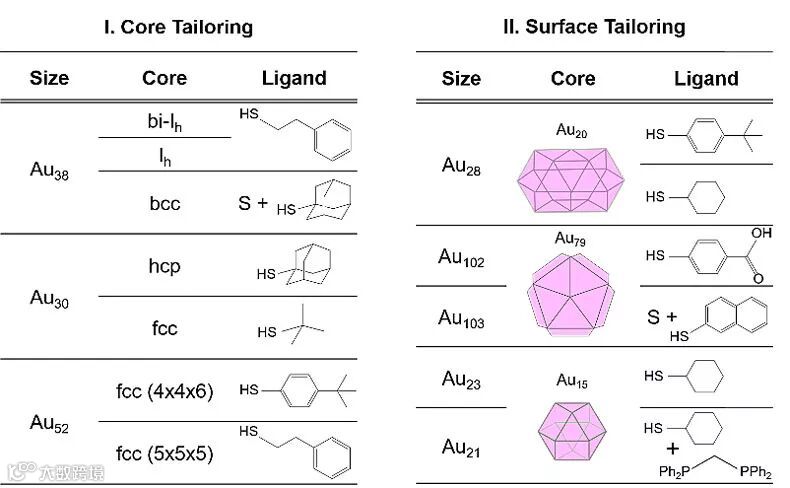 “裁剪”化学的第一方面是对于团簇内核的控制(Scheme 2-I),Higaki等作者列举了三个例子。例一为Au38(PET)24的同分结构异构(其中 PET代表SCH2CH2Ph保护基团),其影响表现在团簇的稳定性、光学性质和催化活性。另外,相比于Au38(PET)24的两个结构异构体,体心立方(bcc)结构的Au38团簇变现出更强的荧光和更高的光催化活性。例二是基于配体的策略而获得的Au30(SR)18的两种不同内核晶相(面心立方fcc和六方hcp),这两个团簇表现出不同的光学性质和溶解度。例三是两个具有不同配体(TBBT与PET)的Au52(SR)32 团簇,这两个的合成也是基于配体的策略,两者都是fcc内核,但具有不同的原子层数和几何形状;两者也表现出性质上的差异。