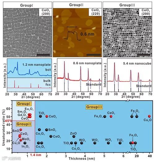 课题组进一步根据之前报道的氧化物纳米粒子获得了基于厚度与表面不饱和配位比率的二元相图。二元相图把氧化物纳米粒子分为三个部分,并制备了一系列的氧化物纳米粒子对二元相图进行了验证。该研究中基于厚度与表面不饱和配位比率的二元相图为亚稳相晶体结构的氧化物纳米材料的设计制备提供了新思路。