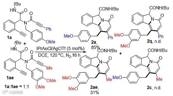 通过一系列的条件优化,作者首先确定了合成pyridoisoindolones的最优条件。利用现场生成的IPrAuOTf做催化剂,以1,2二氯乙烷为溶剂,在120 ℃下反应16小时得到最优的产率。随后对该反应的范围和局限性进行研究。首先对炔酰胺部分取代基R1 进行研究。当取代基R1为芳香取代基,烷烃取代基乃至杂芳环取代基时反应均能顺利进行(2a-2h,图2)。随后对苯环上的取代基R2进行研究。当取代基R2为吸电子基团时,反应可以以较高的收率得到目标化合物pyridoisoindolones(2i-2k)。但是取代基R2为供电子基团时不利于此环化过程(2l-2n)。紧接着作者对不同的迁移基团进行重点研究。3',4'-二甲氧基苄基、3',4',5'-三甲氧基苄基以及4'-甲硫基苄基等均可以作为迁移基团(2q-2u)。但是对于2'-甲氧基苄基以及3'-甲氧基苄基反应并未得到目标化合物pyridoisoindolones(2o,2p)。同样,迁移基团为4'-甲基苄基,烯丙基时反应也不能的得到相应的pyridoisoindolones(2v,2x)。随后对底物中二级酰胺取代基R4的研究发现该取代基的位阻作用对反应路径的选择具有重要的影响。当此取代基位阻较小时(正丁基等),即使当R3为易于迁移的基团4'-甲氧基苄基时,反应只能以较低的收率得到相应的pyridoisoindolones(2aa,2ab,2ac)。反应的主要产物主要是spiroisoquinoline-pyrrole-3,5'-diones 螺环化合物(3aa,3ab,3ac)。作者利用邻位乙炔基喹啉甲醛合成底物来尝试此双环化反应,但遗憾的是该底物在作者优化的条件下并没有得到目标产物(2ae)。
