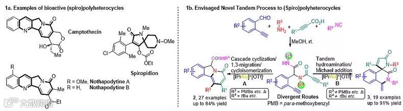 最近,他们利用Ugi四组分反应(邻位乙炔基苯甲醛、有机胺、丙炔酸、异腈),在底物合成过程中成功地引入炔烃等易于转化的官能团。同时,利用离子一价金催化剂对炔烃的活化作用进行分子内的双环化过程合成存在于天然产物中的含氮杂环骨架(图1,1a)。反应的路径是由底物的取代基控制的(1b)。当底物中的三级酰胺取代基R3为易于迁移的基团(对甲氧基苄基等),并且二级酰胺的R4为大位阻取代基(叔丁基等)时,反应倾向于路径A生成pyridoisoindolone稠环化合物2;当底物中三级酰胺取代基R3为较不易于迁移的基团(对甲基苄基等),反应倾向于路径B生成spiroisoquinoline-pyrrole-3,5'-dione螺环化合物3。