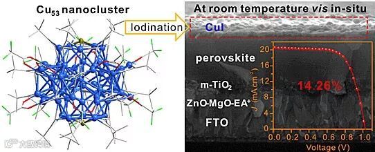该纳米团簇的原子级精确结构由X射线单晶衍射仪和高分辨ESI-MS共同确定,具体结构式为[Cu53(RCOO)10(C≡CtBu)20Cl2H18]+(Cu53)。Cu53为一个四套层结构(Cu3@Cu10Cl2@Cu20@Cu20),其中二十面体@十二面(Cu10Cl2@Cu20)结构也是首次在铜纳米团簇领域被报道。Cu53具有良好的稳定性,无论是固体状还是液态,均能在空气氛围中稳定10天以上。更为新奇的是,Cu53拥有优良的醚溶性。研究者在洁净硅片上面旋涂Cu53乙醚溶液,经过SEM和AFM表征,团簇在硅片上形成了高质量的薄膜,厚度大约为10 nm。另外,Cu53可以在室温下快速与I3-发生碘化反应,生成高晶态的CuI。由于乙醚是钙钛矿太阳能电池的优良溶剂,研究者将Cu53前驱体旋涂在钙钛矿上形成纳米团簇薄膜,并将其转化为高质量的CuI薄膜。相较于商业CuI和其他Cu纳米材料而言,醚溶性Cu53作为前驱体制备的CuI膜更为均一致密。所制备的CuI薄膜是一种优良的空穴传输层,组装的电池效率可达14.3%,在高湿度条件下,电池100小时后仍保持92%的初始效率值,而空白组在20小时内迅速退化失活。相关研究展示,醚溶性Cu纳米团簇室温转化CuI薄膜作为优异的空穴传输材料,在光伏应用领域表现出巨大潜力。