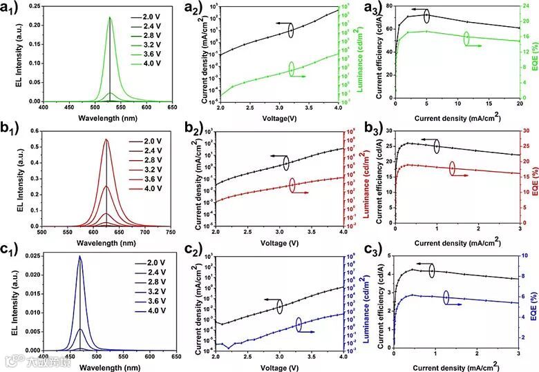 图3. 绿色、红色和蓝色QLED器件的性能。(a1、b1和c1)绿色、红色和蓝色QLED器件随驱动电压增加的EL光谱演变;(a2、b2和c2)绿色、红色和蓝色QLED器件具有最佳效率的驱动电压的电流密度和亮度特性;(a3、b3和c3)绿色、红色和蓝色QLED器件的电流效率和EQE特性。