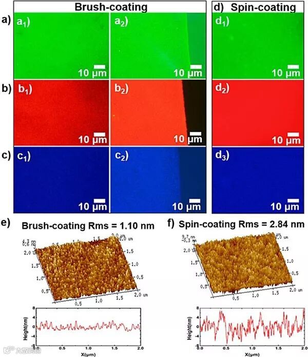 图2. 制备的量子点薄膜的荧光和原子力显微镜表征。通过纤维阵列刷涂(a、b、c)和旋涂(d)制备的绿色、红色和蓝色QD膜的荧光显微镜图像;(e,f)代表性的AFM高度图像和三维图像显示刷涂QD膜的粗糙度值为1.10 nm,旋涂QD膜的粗糙度值为2.84 nm。