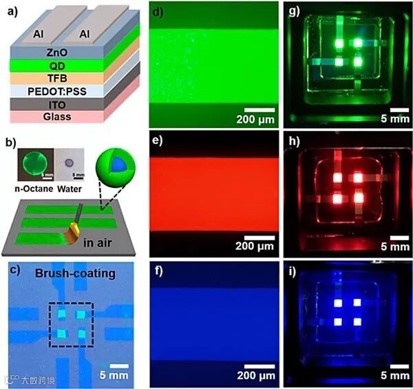 图1. 非对称纤维阵列可控输运QD溶液制备超平滑的QDs图案化薄膜。(a)具有典型多层结构的QLED器件;(b)纤维阵列涂刷工艺示意图,以及QD纳米粒子典型的CdZnSeS@ZnS核/壳结构。插图:分别以正辛烷和水为溶剂的QD溶液在TFB层上的铺展行为;(c)在QLED器件指定的功能区域直接制备绿色QD薄膜;(d–f)制备的绿色、红色和蓝色QD膜的荧光显微镜图像;(g–i)绿色、红色和蓝色QLED器件的电致发光图像。