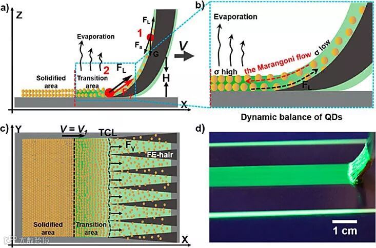 图4. 非对称纤维引导下QDs在整个溶液转移过程中的动态平衡示意图。(a)涂刷过程的侧视图卡通图,其中在锥形纤维的作用下调控QD溶液的转移。在区域1中,QD溶液由于FL、Fa和G的协同作用而稳定地维持在毛笔的纤维内;(b)在区域2中,非对称溶剂挥发引起的Marangoni流和Laplace力的协同作用下,平衡溶液中的粒子分布。σ是表面张力;(c)由锥形纤维引起的TCLs的俯视卡通画,显示两个相邻纤维内形成的多个弯月形TCLs,这有助于沿着纤维产生方向应力;( d )涂刷过程的光学图像,其中QD溶液均匀地转移到基底上。