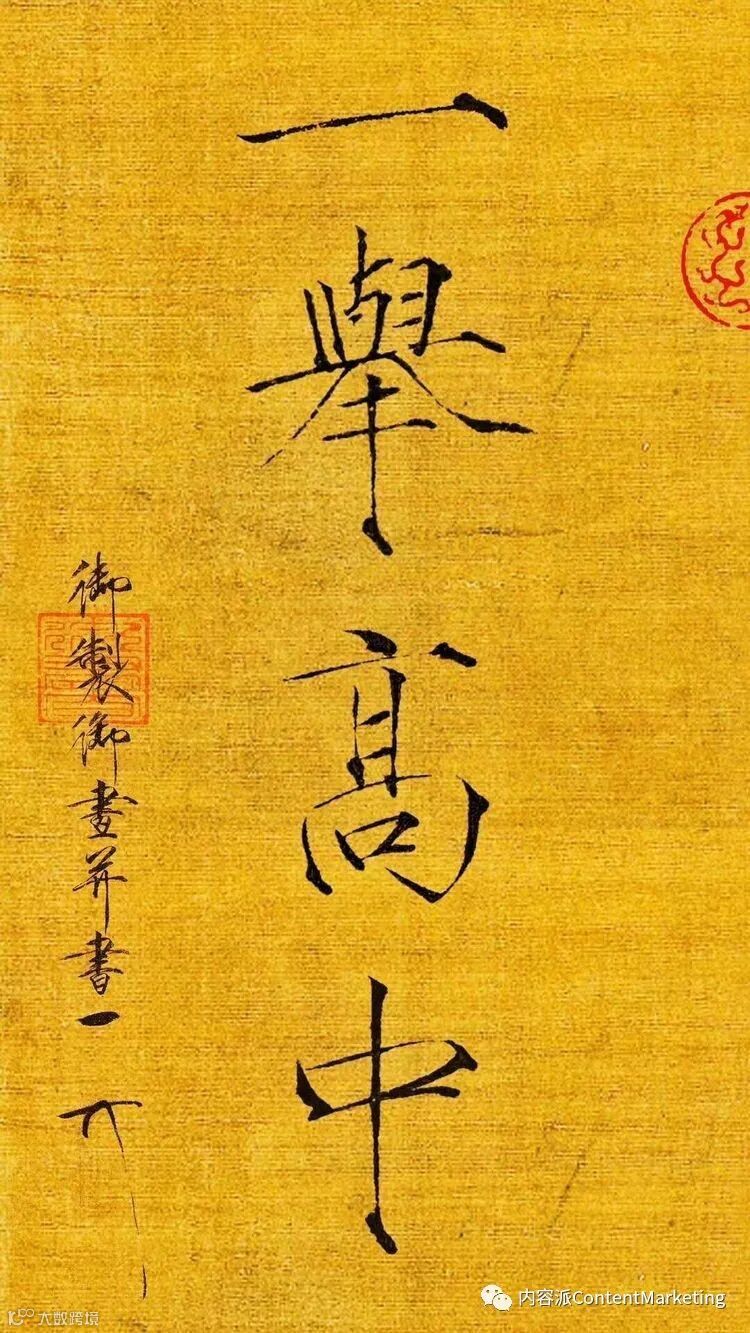 “一举高中”贴,在图的左下角,写的是“御制御画并书”,和宋徽宗专有的“天下一人”的花押。