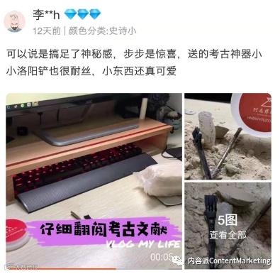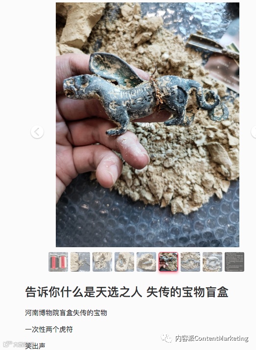 河南博物馆此次营销的脉络,从社交媒体的一些营销号的推广可以看出端倪,先后选择了一些有良好互动数据的大号进行精准沟通投放,主动送出这三款考古盲盒,让一些大V玩盲盒开箱视频,带动一大波粉丝,引起更多的博主拍摄盲盒开箱vlog,进而形成热议,才出现了每晚20:00淘宝店大型“在线等,挺急的”场面。