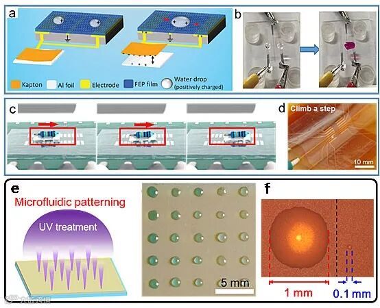 图2. 自驱动静电驱动系统操纵微流体的示意图;(a)基于单电极模式TENG的静电驱动系统驱动水滴运动的示意图;(b)控制液滴聚合的定位反应器;(c)利用液滴实现毫米尺度的微型运输车,TENG可以自由操作微型运输车的移动;(d)TENG可以控制纳升级别的液滴翻越台阶;(e)光控亲疏水转换材料;(f)TENG驱动的液滴图案化。