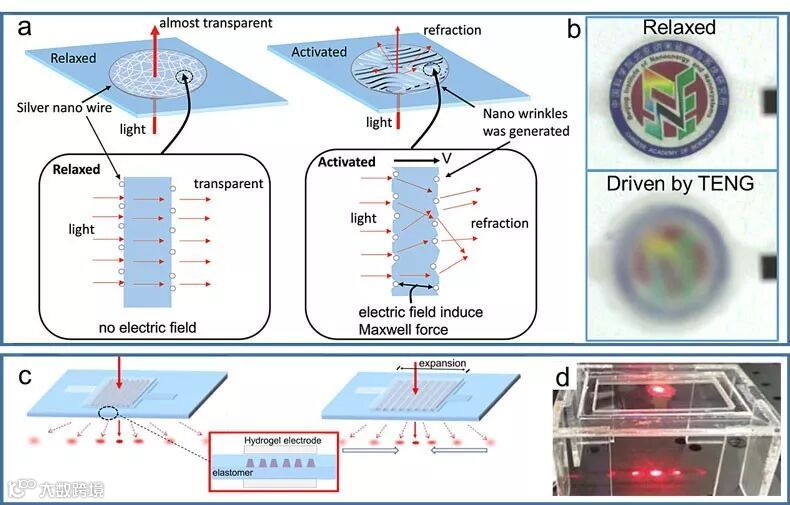 图1.(a)基于TENG-DEA系统的摩擦电可调谐智能光调制器示意图,其中弹性膜的透射率可以通过接触分离运动来控制;(b)弹性膜的不透明度变化,通过TENG的接触分离运动控制其透明度;(c)基于TENG和水凝胶电极的弹性光栅;(d)光栅形变导致衍射性能变化。