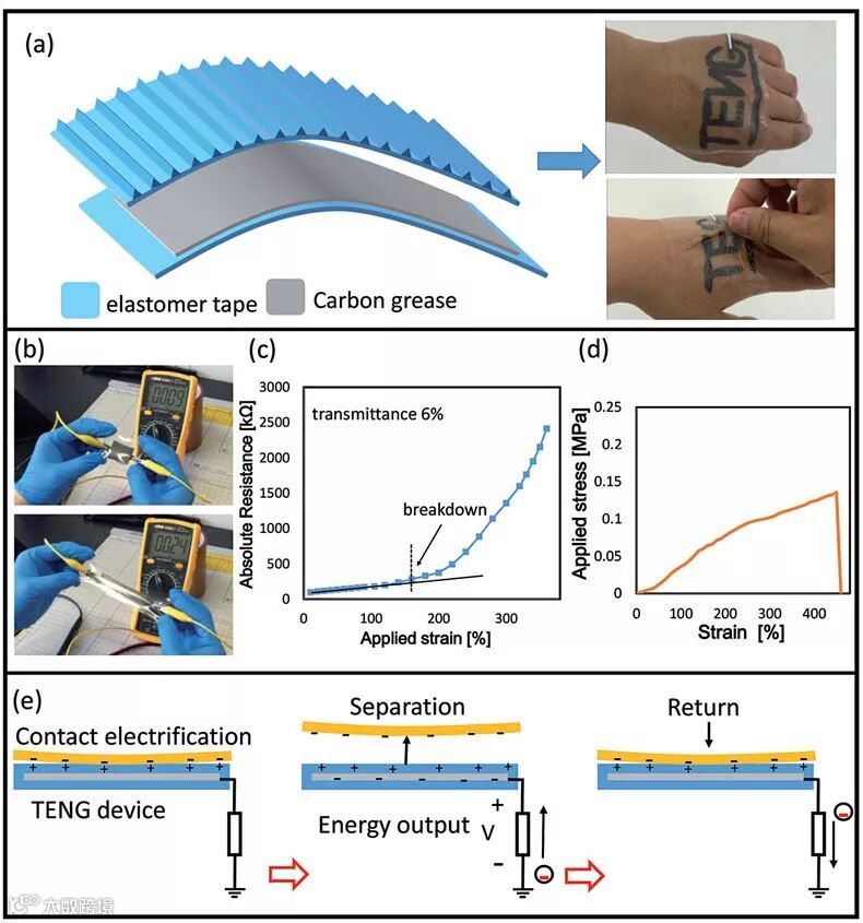 图3.(a)弹性TENG的基本结构与附着在人手上的照片;(b)弹性碳脂电极电阻随拉伸率变化的照片;(c)电极导电性(电阻)随拉伸率的变化;(d)可拉伸电极弹性应变的单轴拉伸试验,应变可达450%。