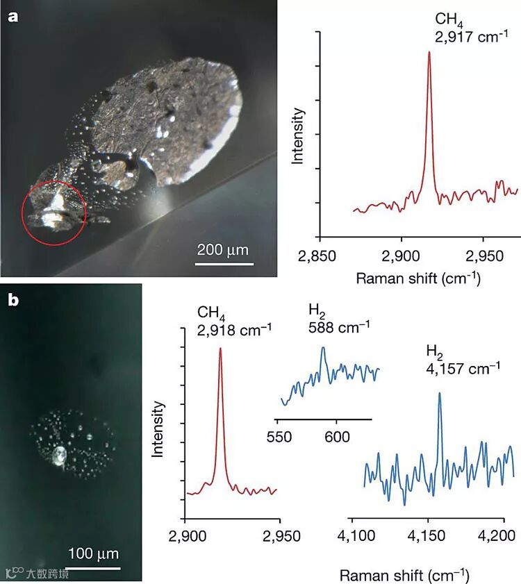拉曼光谱测试包裹体周围的氢气和甲烷。图片来源:Nature