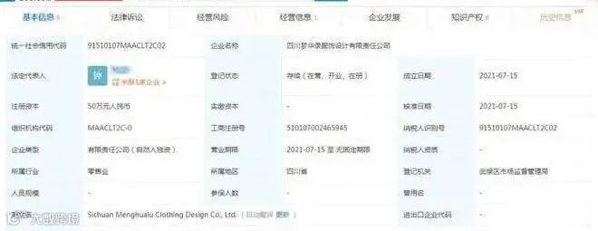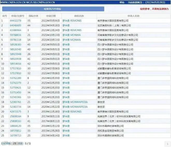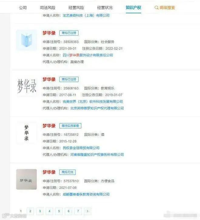 值得关注的是,一家四川的企业直接以 " 梦华录 " 作为企业字号,该企业公司成立于 2021 年 7 月《梦华录》杀青之后,随即在同年 9 月提交了 5 件 " 梦华录 " 商标的注册申请。如今,这些商标除了 41 类教育娱乐没有注册成功之外,其他几个类别的商标状态都显示“已注册”。