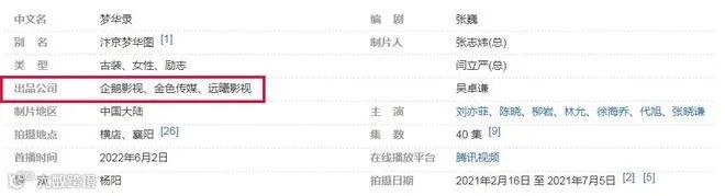 在百度百科查询显示,《梦华录》出品公司为企鹅影视、金色传媒、远曦影视三家公司,但在“梦华录”商标申请人中,均未出现三家公司中的任何一家。