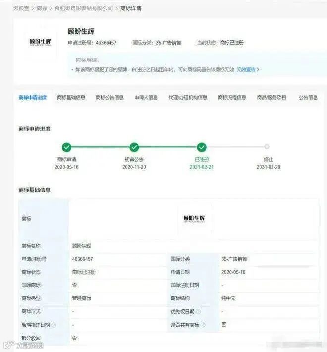 据网上信息显示,自 2013 年以来,“梦华录”“顾盼生辉 ”商标已陆续被多家公司申请注册,国际分类包括广告销售、餐饮住宿、食品、医药等,其中多个商标已注册成功。