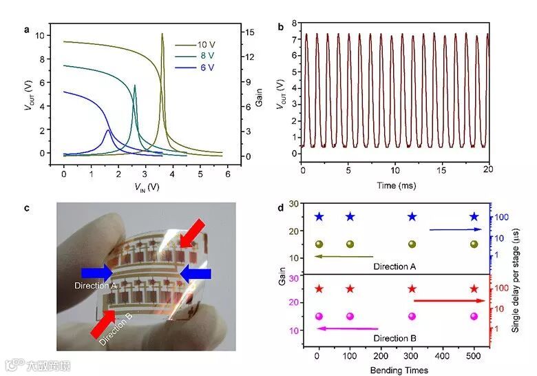 在此基础上基于共聚物绝缘层制备的柔性电路(反相器和振荡器)也展现出了很好的逻辑功能和柔韧性能。反相器的增益可以达到15,振荡器信号传播延迟可以做到100 μs。柔性电路沿着图示方向弯曲(弯曲半径5 mm)达到500次的时候,反相器和振荡器的性能几乎没有发生衰减。