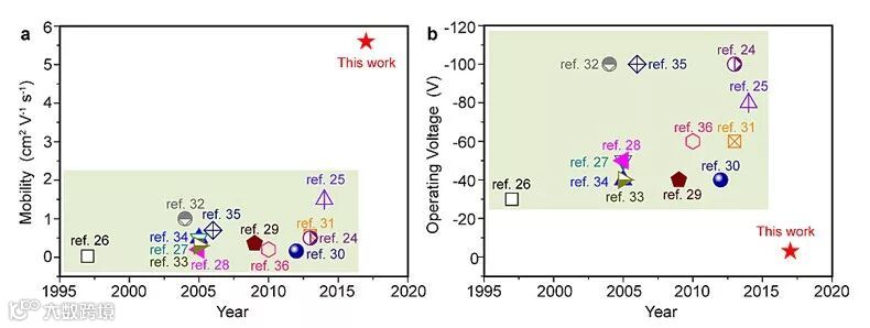 图2.(a)以聚酰亚胺作为绝缘层的器件迁移率对比。(b)以聚酰亚胺作为绝缘层的器件操作电压对比。