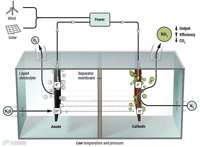 研究者通过探索,发现利用反向燃料电池(reverse fuel cell)可以在温和的反应条件下将电解水产氢与氮氢反应制氨合并:水在阳极发生氧化反应生成氧气和氢离子(H+),氢离子移向阴极;氮气在阴极得电子,和氢离子结合形成氨。使用电力,完全可以由风能和太阳能提供。