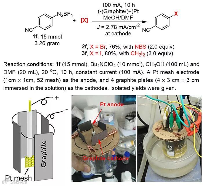 除此以外,作者使用廉价的大尺寸石墨板作为阴极进行3 g规模的放大实验,溴化和碘化分别得到了76-80%的收率,证明了该反应具有很高的实用价值。