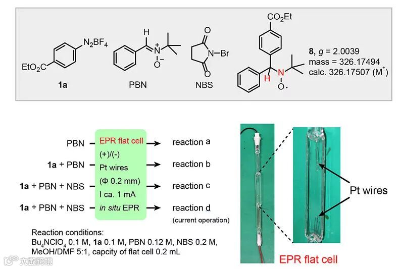 作者还设计了四个原位反应得到丰富的信息。以反应b为例,重氮盐在阴极还原得到芳基自由基,随即被PBN捕获得到相对稳定的自由基化合物8。通过超精细偶合常数、g值以及HRMS数据,作者可以确定化合物8是芳基自由基与PBN的加合物。此外,四个反应自由基浓度随时间变化如图7所示。当开始通电时,自由基的浓度显著提升,表明自由基的产生是电流所致;此外,从反应c和d可以看出,NBS等试剂的加入将改变反应路径。芳基自由基可以被许多试剂如NBS、CH2I2、PBN以及TEMPO捕获。