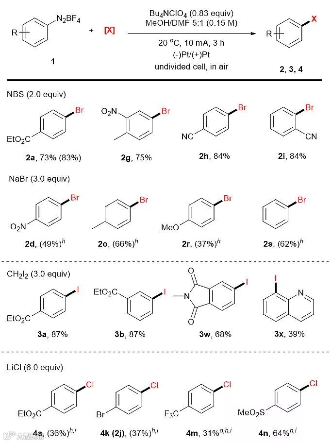 图2. 电化学重氮盐卤化反应底物适用范围的考察。图片来源:Chem. Sci.