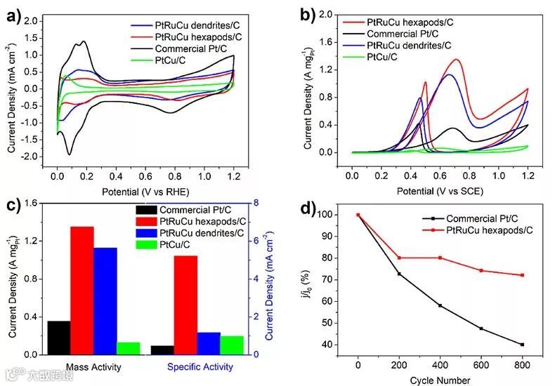武汉理工大学的研究团队采用油胺、一氧化碳、葡萄糖共还原的方法,CTAB作为表面活性剂,通过基于Stranski Krastanov生长和电偶置换的简便方法成功地制备了六足PtRuCu合金纳米晶,并作为直接甲醇燃料电池(DFMCs)的高效催化剂。他们利用有机溶剂还原法合成了直径约为28 nm左右的具有六足状形貌的PtRuCu合金。研究表明,在甲醇氧化过程中,三元合金的Ru可以形成Ru(OH-)以促进吸附在催化活性点上CO的氧化剥离,而合金化的Cu可以通过配位效应改变d带,优化Pt表面的电子结构。