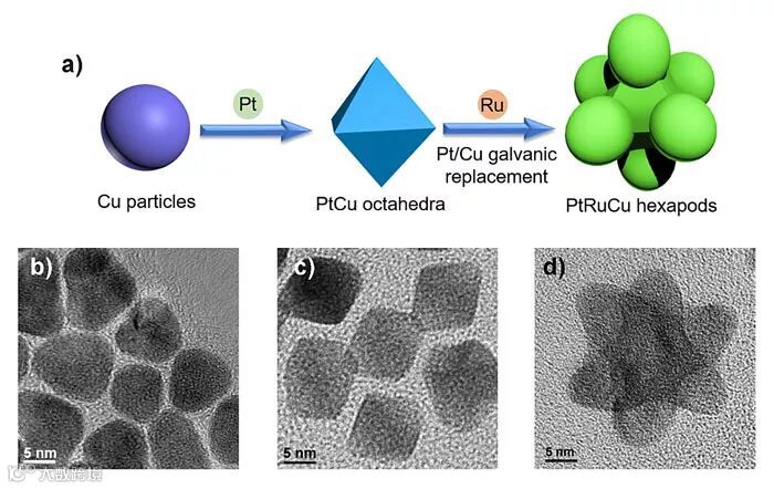 目前,甲醇燃料电池中最常用的催化剂是商业Pt/C催化剂。然而,Pt作为一种贵金属存量较少、价格高昂,实际使用中稳定性较差。因此,开发成本较低、高活性、高稳定性的甲醇燃料电池催化剂成为研究重点。最近,武汉理工大学的木士春教授、何大平教授和唐浩林教授(共同通讯作者)课题组通过Stranski Krastanov生长和电偶置换的方法,合成了一种具有优异甲醇氧化性能六足状形貌的PtRuCu合金催化剂。