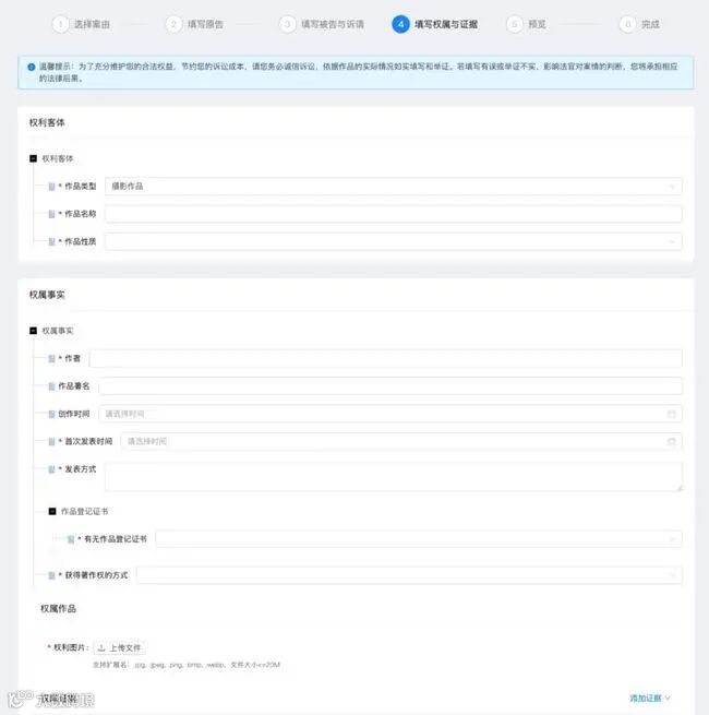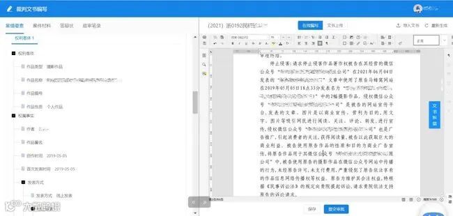 针对原告起诉,系统从权利作品、权利主体、侵权行为和责任承担四大维度形成要素式的起诉界面,原告无需求助专业律师,只要填写要素化的表单信息,系统就会自动生成起诉状,大幅降低原告维权门槛。