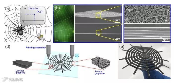近年来,人们对集成电路、可穿戴设备、植入电子等柔性电子的需求不断增长,极大促进了柔性电子领域的发展。复杂环境下的多分析检测要求多维精准响应和信号顺畅传递,以保证识别分辨率和检测灵敏度。然而,如何解决多材料集成的界面融合问题和单材料的功能单一问题仍然是当前多分辨传感器领域的一个挑战性课题。近日,中国科学院化学所的宋延林研究员、李风煜副研究员课题组和沈阳建筑大学的马颖副教授课题组的研究人员受蜘蛛网中螺旋线和放射线微结构和独特组装方法的启发,研制出一种新型多分辨的石墨烯触觉传感器。