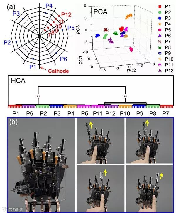 宋延林团队以高灵敏的石墨烯气凝胶作为感应材料,以高导电性和高稳定性的石墨烯带作为传输材料,选用统计学上的主成分分析(PCA)、分层聚类分析(HCA)和线性判别分析(LDA)来评价石墨烯多结构传感器的空间分辨能力。结果表明,集成不同结构的设计可以实现方向、距离和位置的识别。为了进一步证明多结构石墨烯在柔性电子中的应用潜力,他们设计了紧密堆积结构石墨烯和多孔结构石墨烯集成的电子皮肤。机械手指可由相应的石墨烯气凝胶单独控制,用手指在石墨烯气凝胶上轻轻划过就可以操纵机械手指的弯曲和伸展,经测量最小力可达3.83×10-3 Pa。
