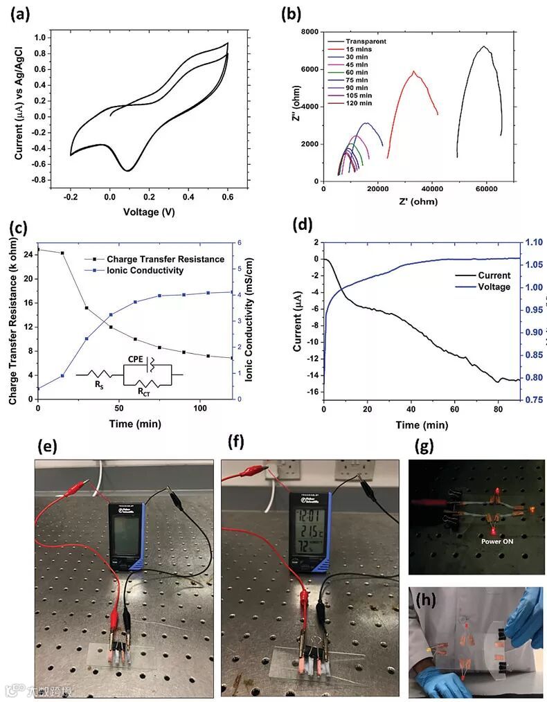 此外,该水凝胶体系在吸水之后电学及电化学性质也会发生较大改变,可作为导电油墨在柔性印刷电路板中广泛应用;同时该水凝胶体系易于清除和可重复利用,这在减少固体电子废弃物等方面具有独特的优势(下图g-h)。研究小组还发现,以这种水凝胶为电解质的电化学电池可以产生相当于一节AA电池的功率输出(下图d),足以为小型电子设备(数字时钟/温度计/湿度计,下图e-f)供电。