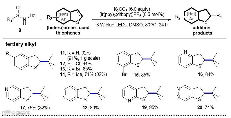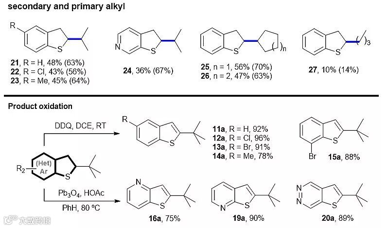 该自由基加成反应适用于一系列取代的苯并噻吩(11-15)及苯杂并噻吩化合物(16-20)。三级烷基自由基的反应最佳,可获得良好到优秀的产率;二级烷基自由基次之。相比之下,一级烷基自由基的反应情况较差,如正丁基自由基前体与苯并噻吩反应时,仅有14%的转化率(化合物27)。该反应可扩大到克量级规模,产率并不受影响(如化合物11)。此外,加成所得的2,3位氢化产物在DDQ或Pb3O4等条件下很容易转化为相应的氧化产物。该方法为C2-取代苯(杂)并噻吩类化合物的合成提供了新的选择。