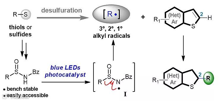 近年来,光氧化还原催化(photoredox catalysis)策略可利用光能,通过单电子转移途径实现丰富多样的化学转化而备受关注。最近,四川大学华西药学院的秦勇教授/刘小宇副教授团队实现了光催化下以N-酰基取代烷基亚磺酰胺为前体产生烷基自由基的新途径,并通过加成反应成功合成了C2-取代的苯(杂)并噻吩类化合物。如下图,氮自由基中间体I的裂解被认为是产生相应烷基自由基的关键过程。