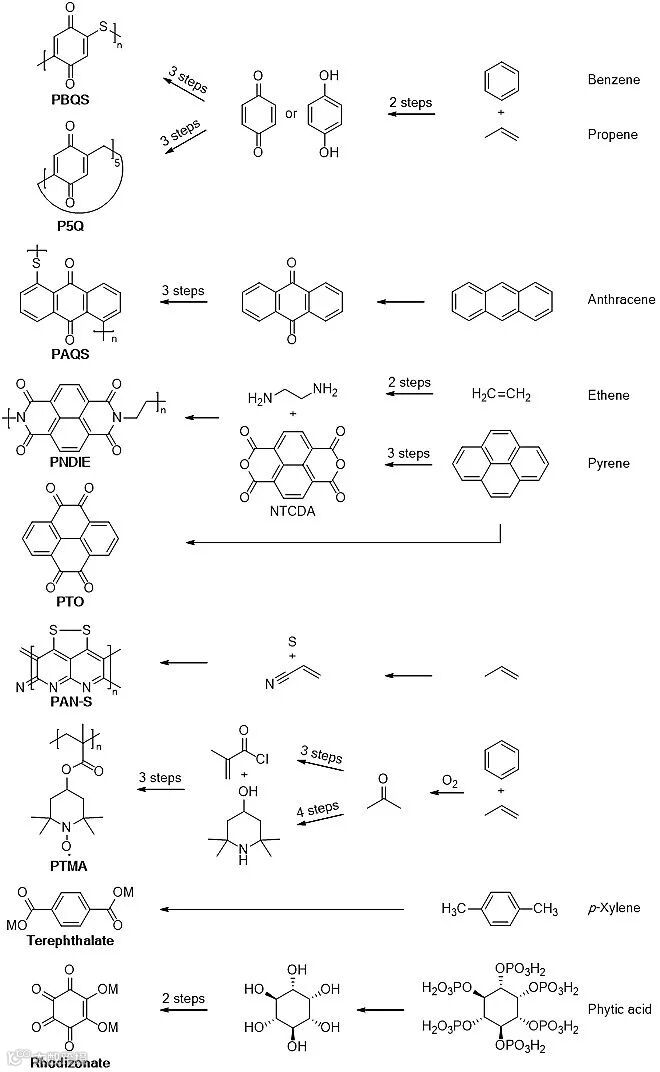 图3. 代表性有机电极材料的分子结构、合成路线及起始原料。左列为图2中有机材料的分子结构。中列为合成这些材料的商品原材料。右列为合成这些原材料的基本化合物,通常从石油和生物质直接提炼得到。图片来源:Joule