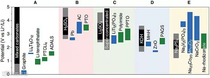 图4. 各类电解液的电化学稳定窗口和代表性电极材料的工作窗口。五个电解液体系包括:非水(A),酸性(B),近中性(C),碱性(D)和全固态(E)。黑色条:各电解液的热力学稳定窗口。灰色条:因为SEI形成而拓宽的窗口。蓝色条:当前使用的无机电极材料的工作窗口。绿色条:有机电极材料的工作窗口。图片来源:Joule