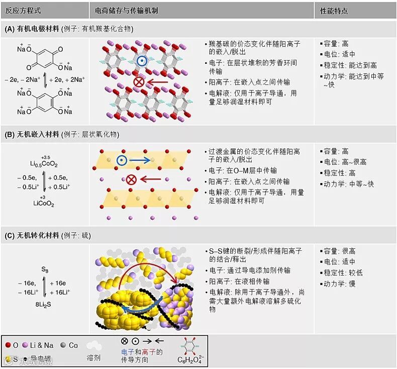 图 1. 代表性有机与无机电极材料的电极反应与电荷储存机制示意图。(A)有机电极材料,如有机羰基化合物(图为2,5-二羟基-1,4-苯醌二钠盐);(B)无极嵌入材料,如层状氧化物(图为钴酸锂);(C)无机转化材料(图为硫)。图片来源:Joule