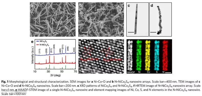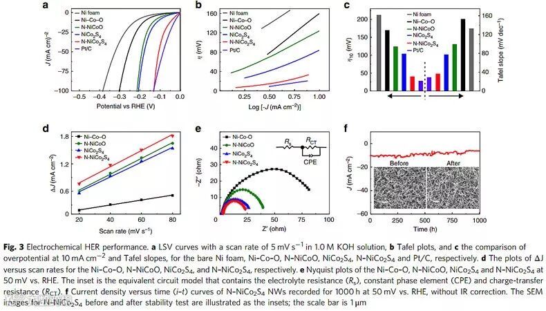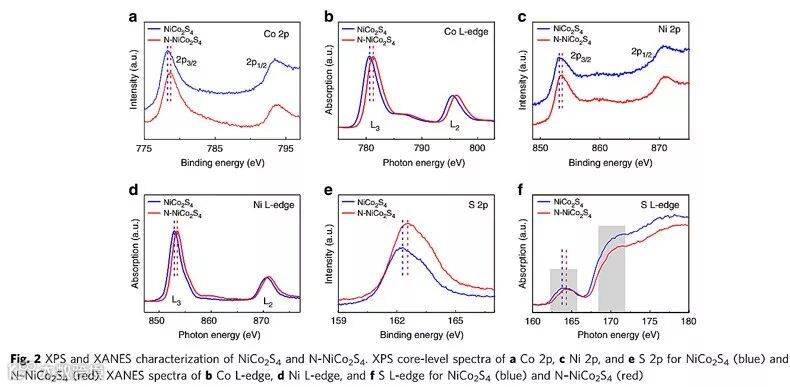 过渡金属硫化物NiCo2S4具有杂化的d轨道、丰富可变的价态,在多相催化反应中具有广泛的应用。然而之前的研究发现,NiCo2S4催化剂电解水析氢的能力较差,与目前基准析氢催化剂Pt/C的催化性能相比依然具有较远的差距。一个很大的原因是金属硫化物在析氢反应过程中,S的强电负性在作为H的吸附位点时与吸附态H*具有很强的相互作用,导致吸附态H*难以离去,限制了其催化性能。虽然形貌调控能在一定程度上增加催化性能,但其难以从根本上改变硫位点的吸附性质。因此作者立足于调控催化剂表面的电子密度,通过在金属硫化物晶格中引入N,利用强电负性N元素取代S位点作为牺牲位点,间接弱化S与金属的成键达到降低S位点的电子密度,进而降低吸附态H*与S位点的相互作用,促进电解水析氢的过程。