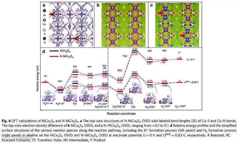 相关材料的制备和表征如下,他们还结合XPS和XANES表征证明N的引入可以实现对材料表面电子密度的调控。电催化表征显示N掺杂的NiCo2S4在10 mA/cm2的电流下过电势为41 mV,已经非常接近商用Pt/C(20 wt%)的催化性能,而且该催化剂也具有优异的稳定性。作者通过DFT的电荷密度差分图可以直观看到,N会改变Co的电子密度,进而影响S位点的电子密度。为了进一步阐明N掺杂对催化过程的影响,作者模拟了整个反应的动力学过程。H2O分子更倾向于通过与放热过程的Co-O相互作用占据Co的顶部位置。N的引入可以显著降低水分子解离反应在NiCo2S4上的能垒,进而促进水的解离和氢气的析出。