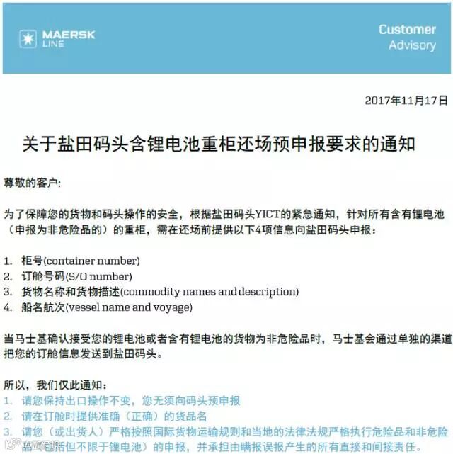 为防止此类事故再度发生,马士基发布盐田码头含锂电池重柜还场预申报要求的通知,具体如下: