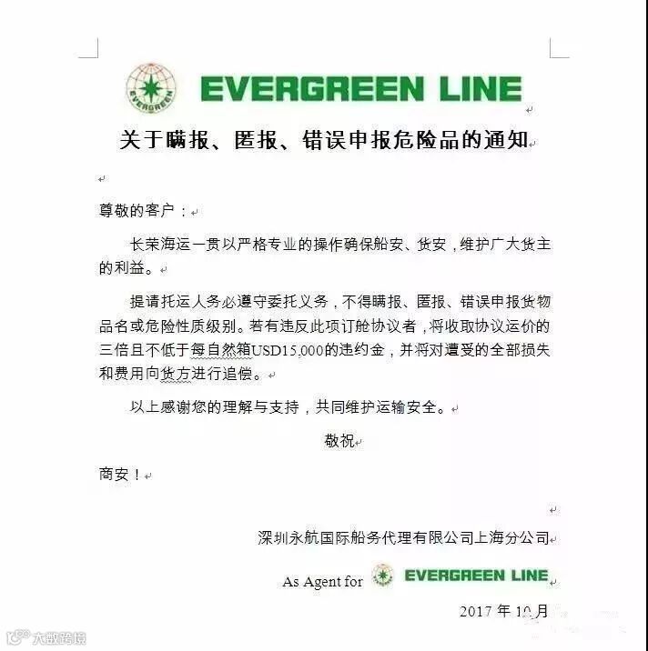 长荣海运发布通知,为了确保船安、货安,维护广大货主的利益,托运人不得瞒报、匿报、错误申报货物品名或危险性质级别。若违反此项订舱协议,将收取协议运价的三倍且不低于每自然箱USD15000的违约金。